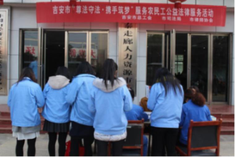 2018年1月19日,市总工会、市司法局、市律师协会联合开展了吉安市“尊法守法•携手筑梦”服务农民工公益法律服务活动,此次公益活动在井冈山经开区人力资源市场举行。