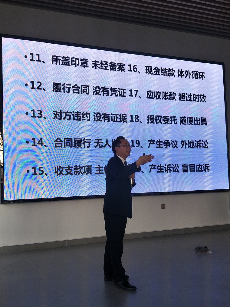 练继勇律师是全国青年律师领军人才,常年从事企事业单位法律风险管控工作,为我市近百家政府、企业单位提供法律服务。授课一开始便以“借条应如何正确书写”这一与在座所有公司成员日常生活切身利益相关的话题激发聆听者的听课兴趣,并免费提供规范的借条模板;此次授课练律师以其专业视角,从企业开展合同风险管理的必要性以及重要性切题;结合多年办案经验,穿插大量案例和时事热点,列举企业常见的20种合同风险,并提供专项破解方案以及实操建议;多次强调合同履行防控关键的“履行义务、保留凭证;对方违约、固定证据”十六字箴言,深度解析如何进行合同风险管理。