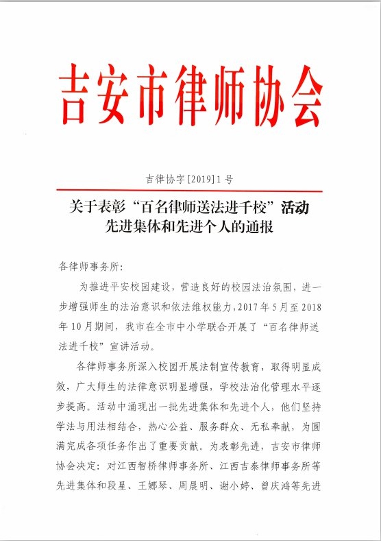 为表彰先进,吉安市律师协会决定对我所及我所谢小婷律师予以通报表扬。我所及我所律师谢小婷喜获“百名律师送法进千校”宣讲活动先进集体和先进个人。
